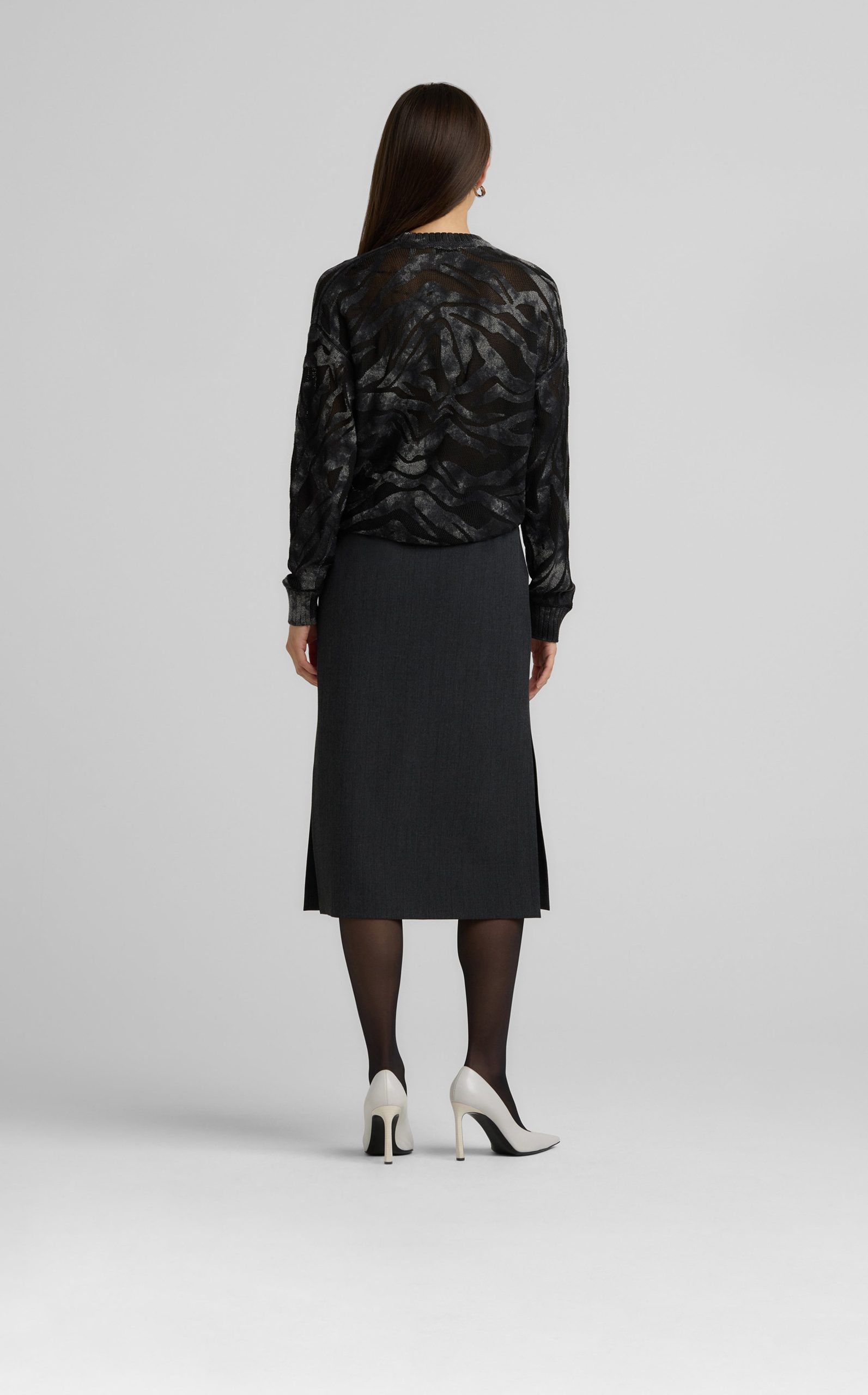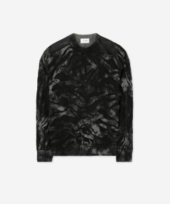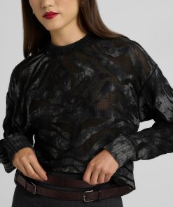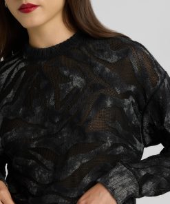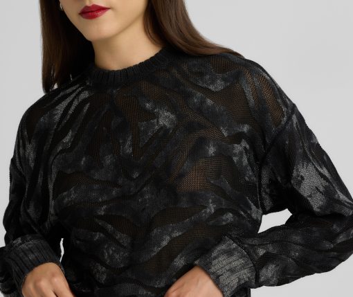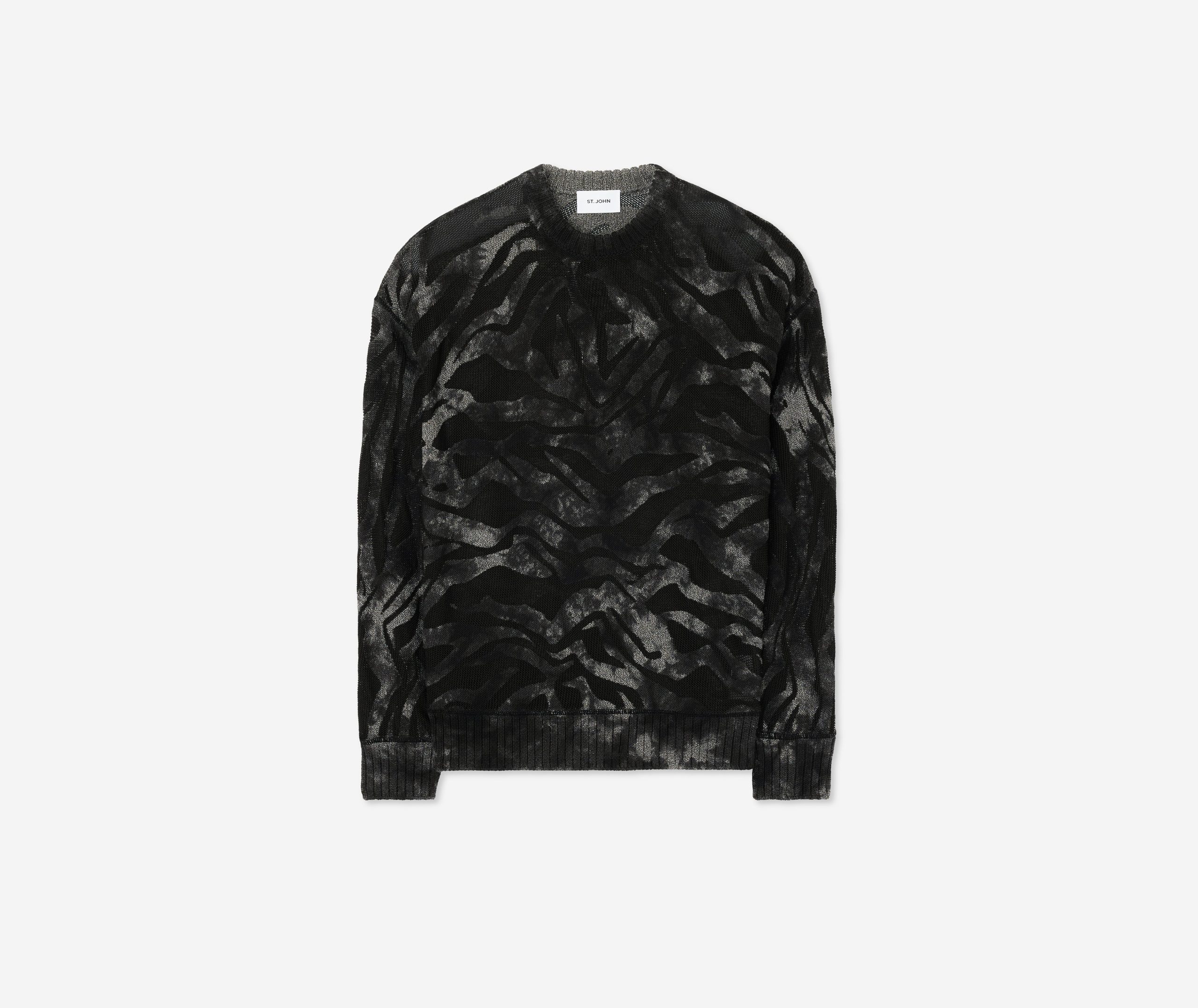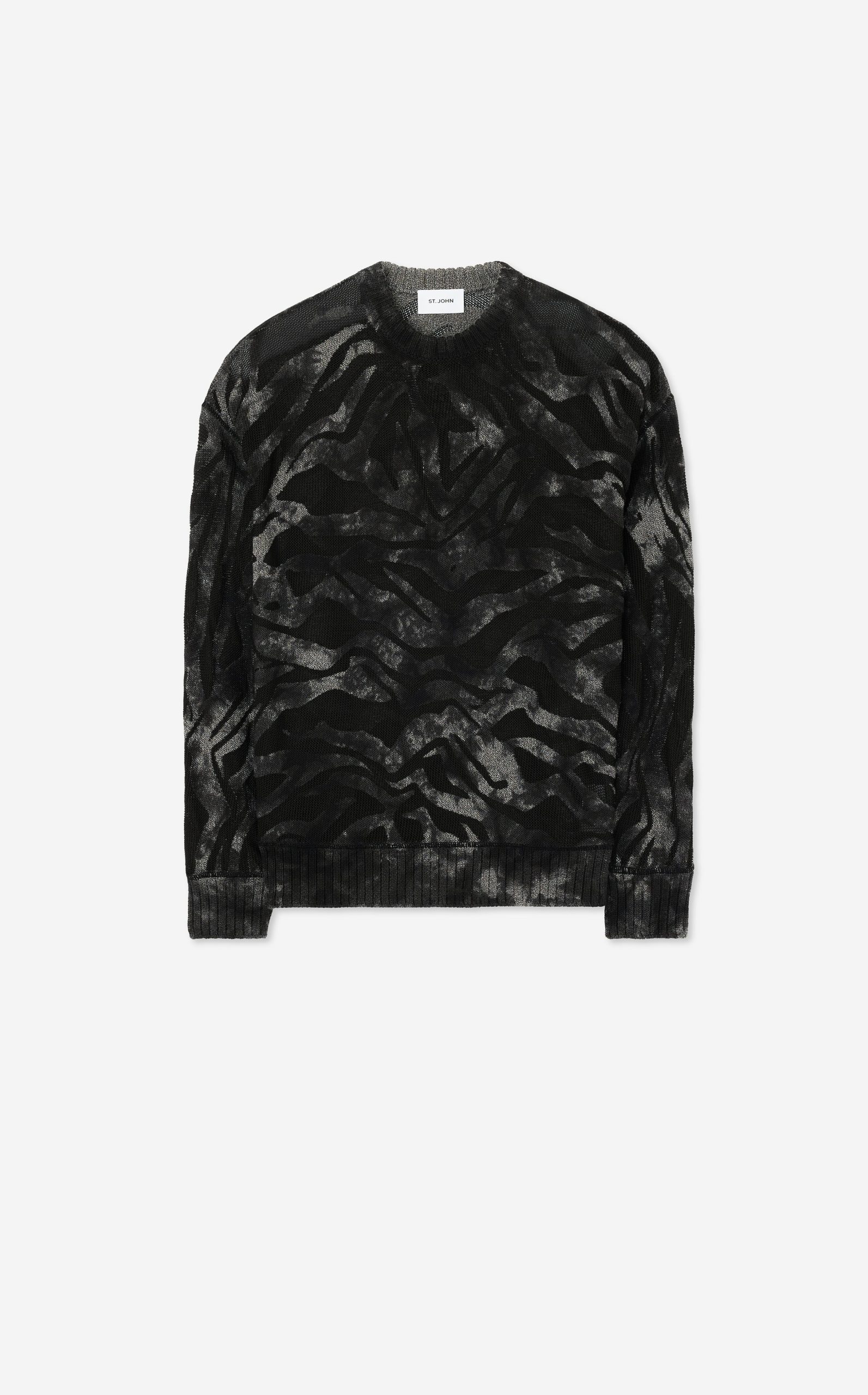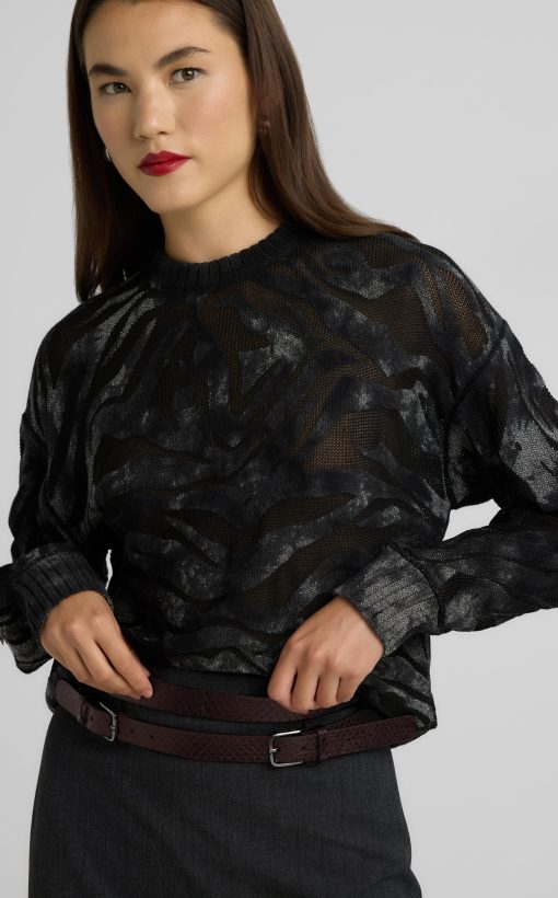 Animal print at its chicest. This crewneck cotton-blend sweater features burned out zebra stripes, reimagining the familiar favorite in a tonal top.All Sales are Final. No Returns or Exchanges.