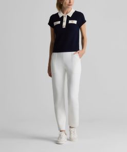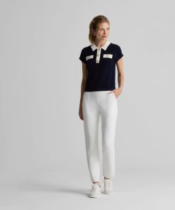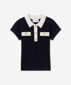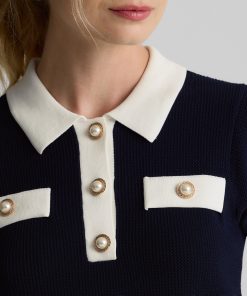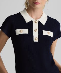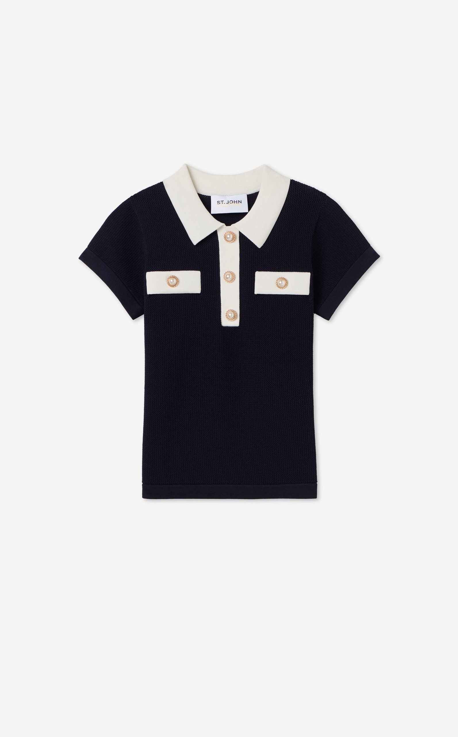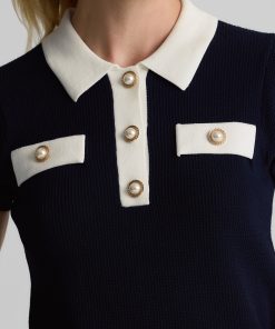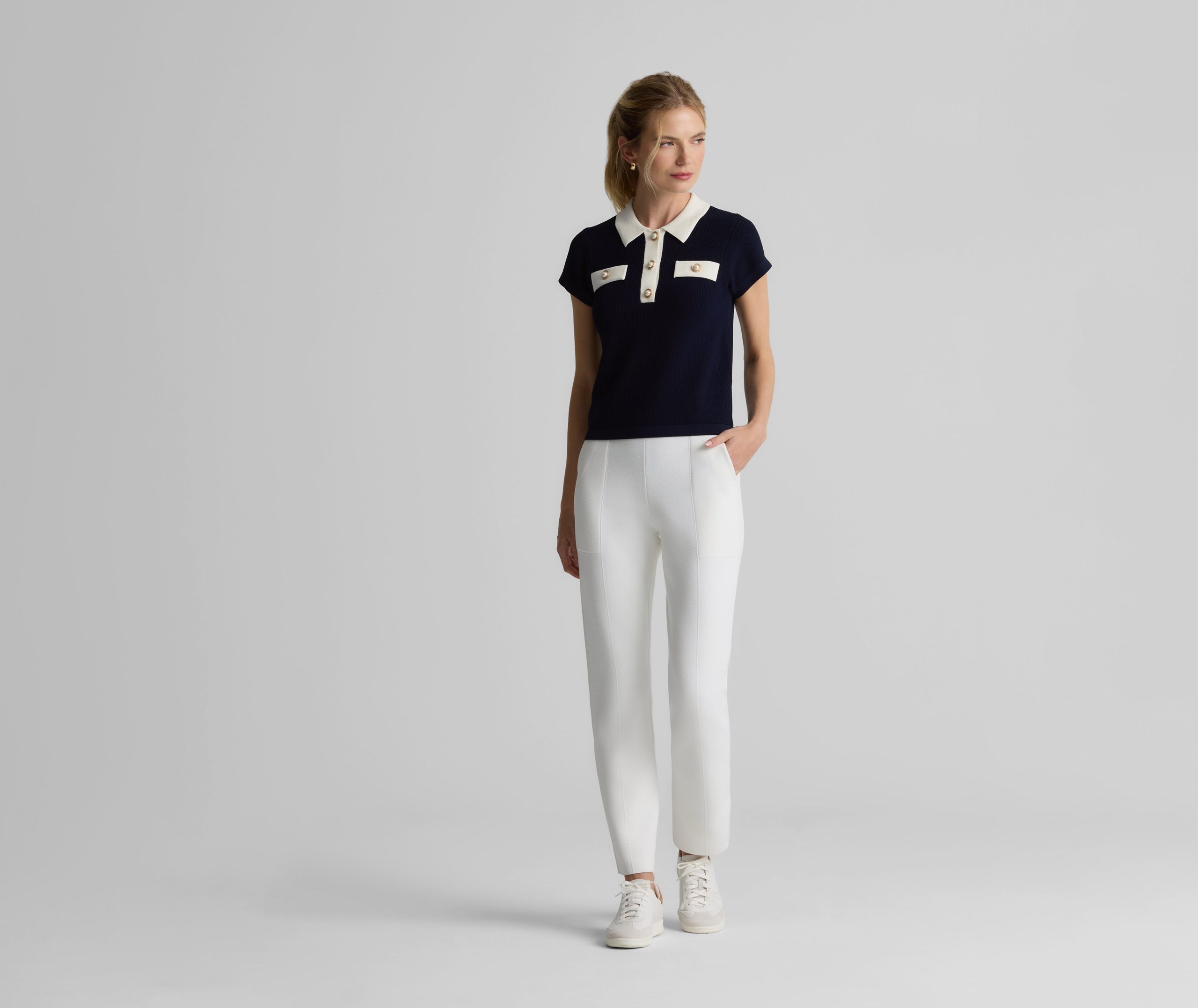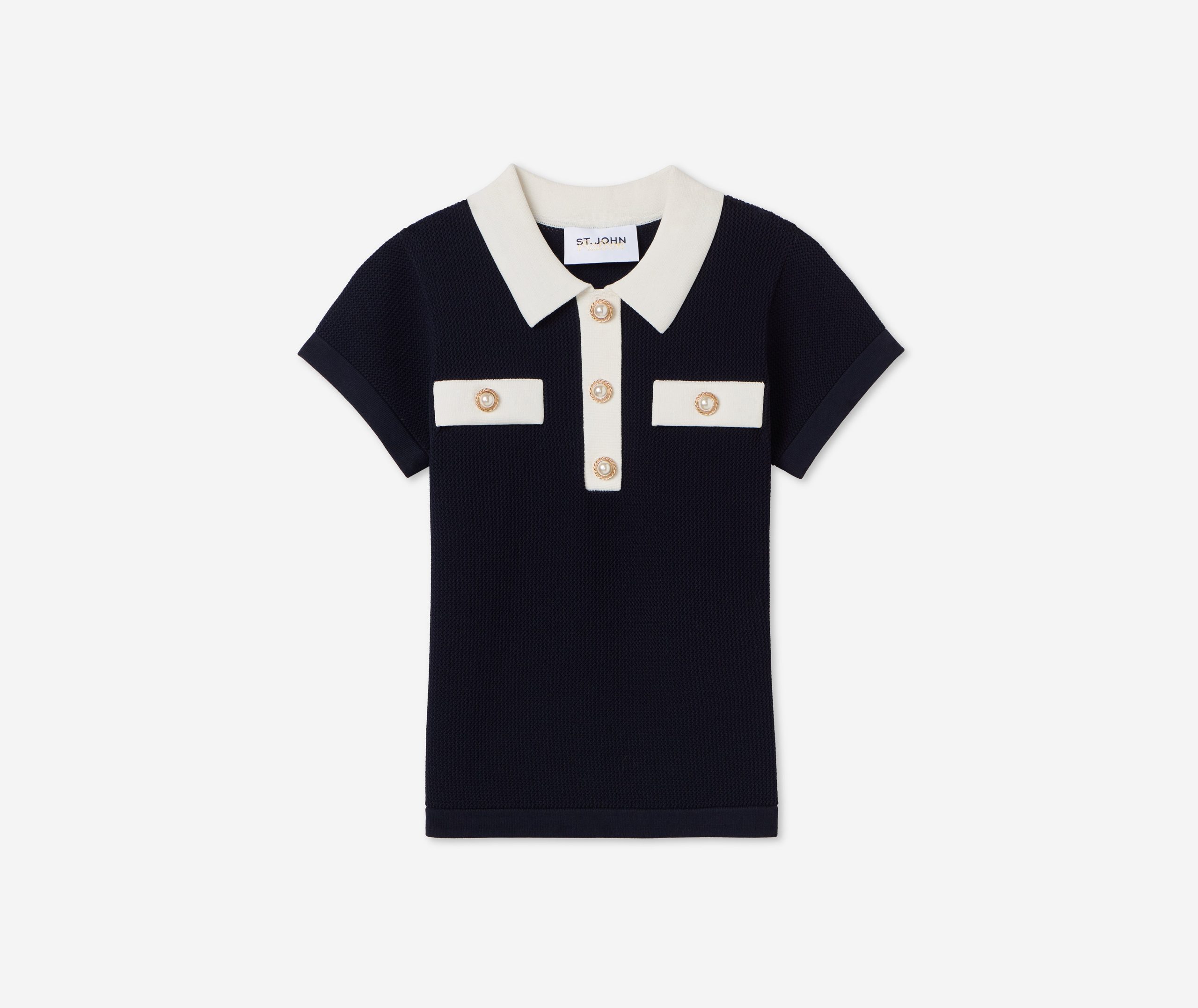 Created in an exclusive collaboration with influential golf brand Malbon, the Camryn gives the classic polo a glamorous, vintage-inspired twist. This cap sleeve sweater in made-to-move Contrast Knit finished with charming pearl buttons pairs perfectly with a pleated skirt on the course or tailored pants and denim for your other luxurious, leisurely plans.