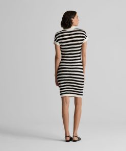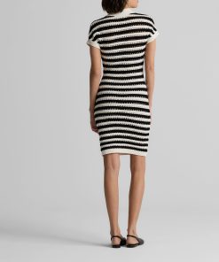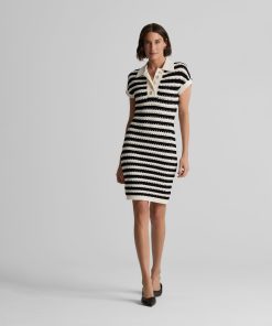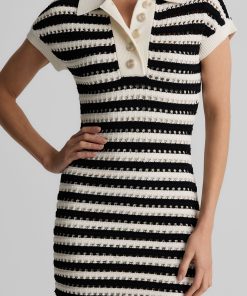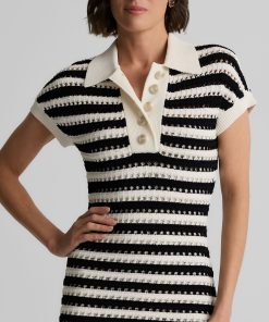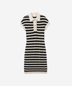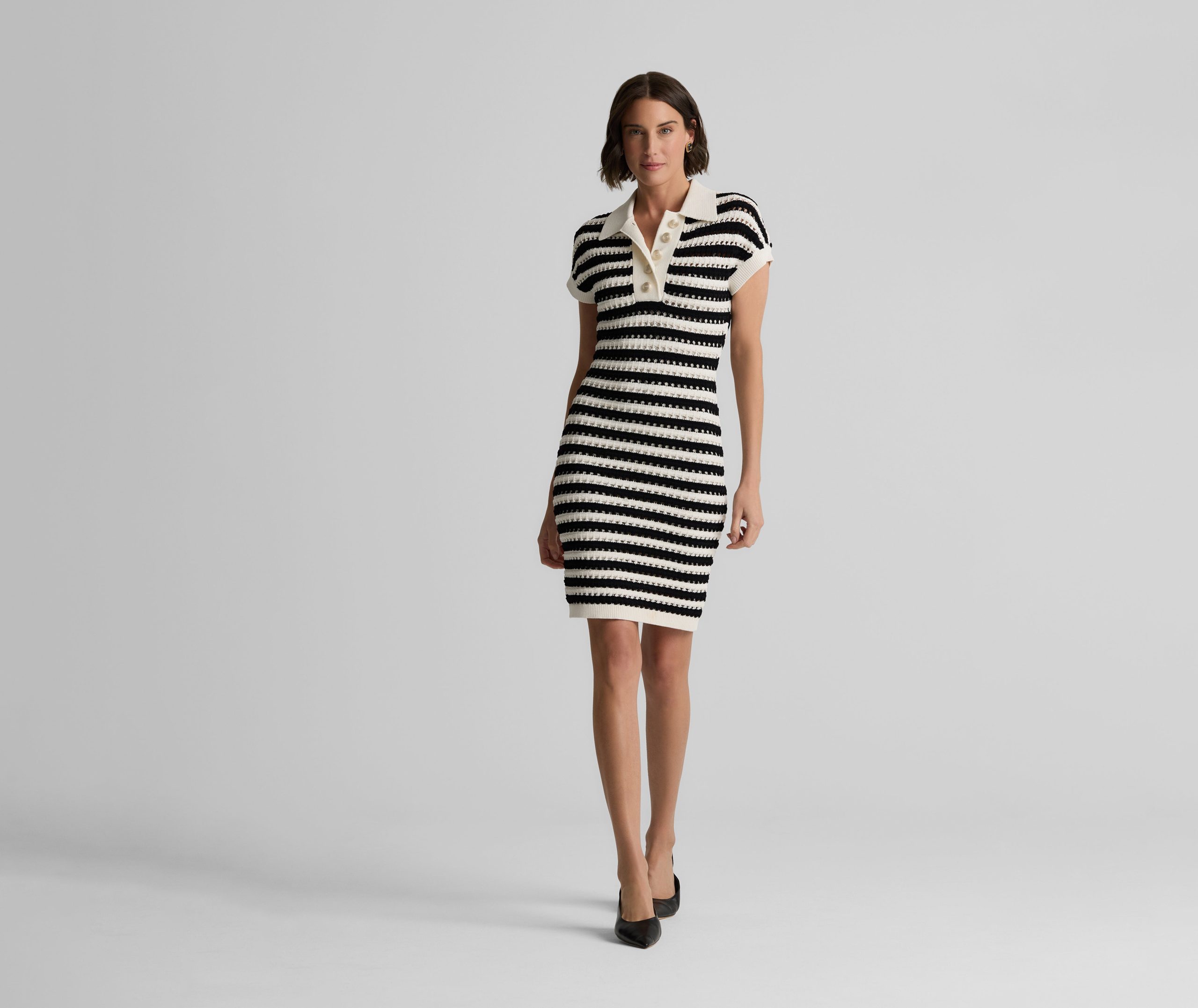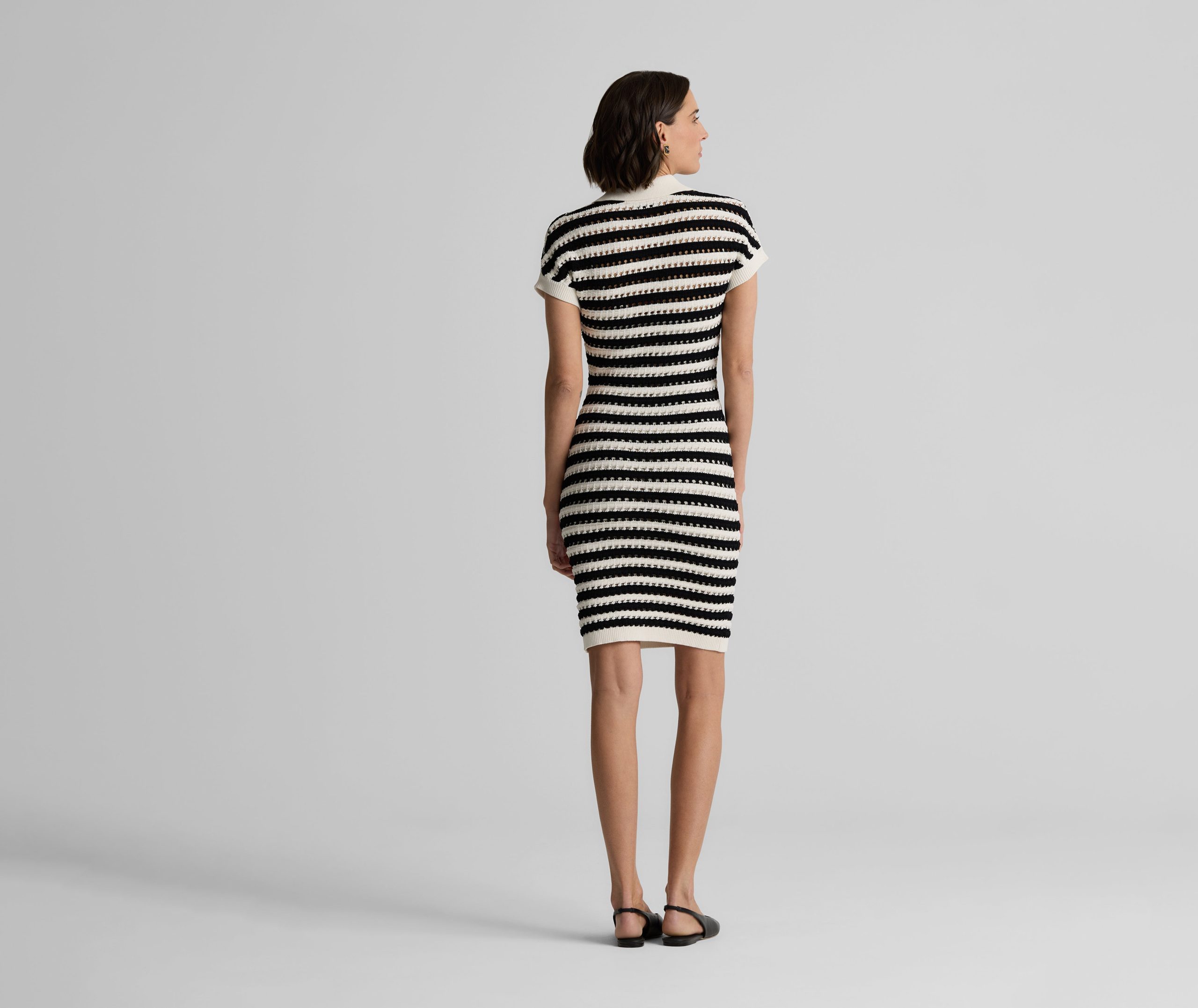 The Casey updates the classic polo silhouette with a modern twist. Crafted in our breezy Pointelle Knit in bold Ecru and Black stripes and finished with delicate cap sleeves and decorative fabric buttons, this figure flattering dress is subtly sporty, yet undeniably refined for luxurious luncheons and other afternoon outings with a chic, laid-back dress code.