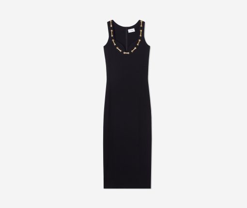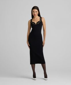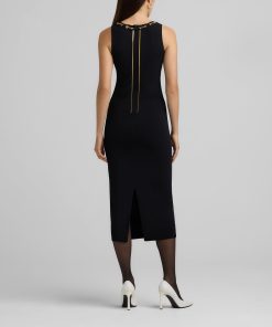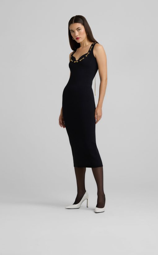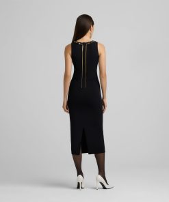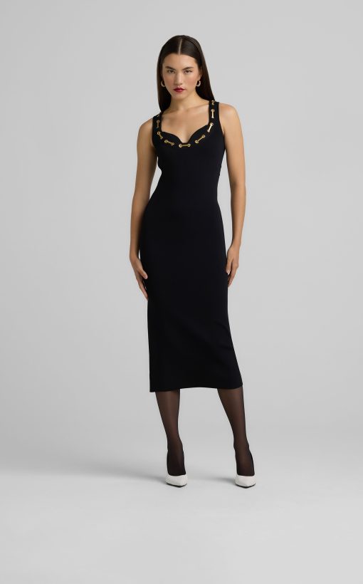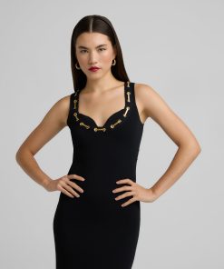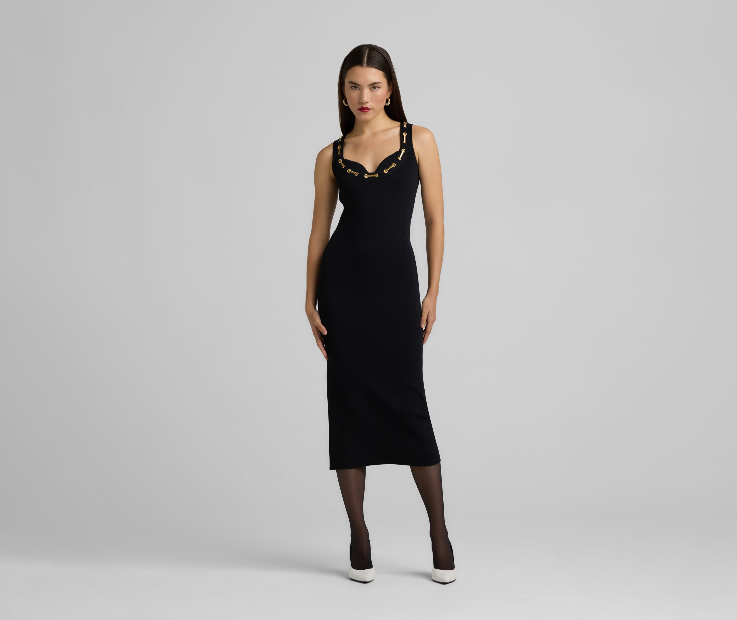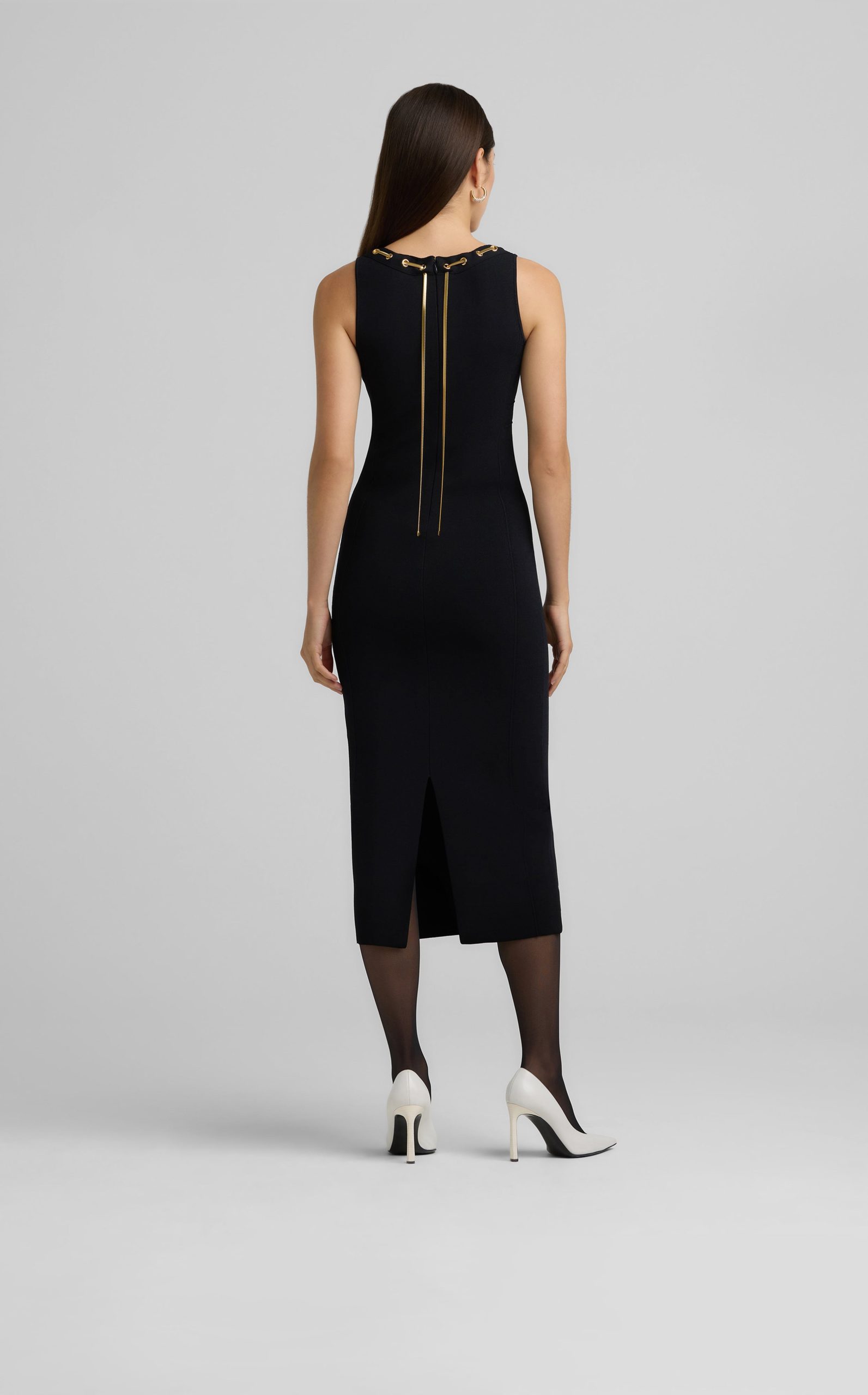 A woven chain detail adds edge to a sweetheart neckline in this sleeveless Milano knit short dress, as golden touches bring drama to the back.All Sales are Final. No Returns or Exchanges.