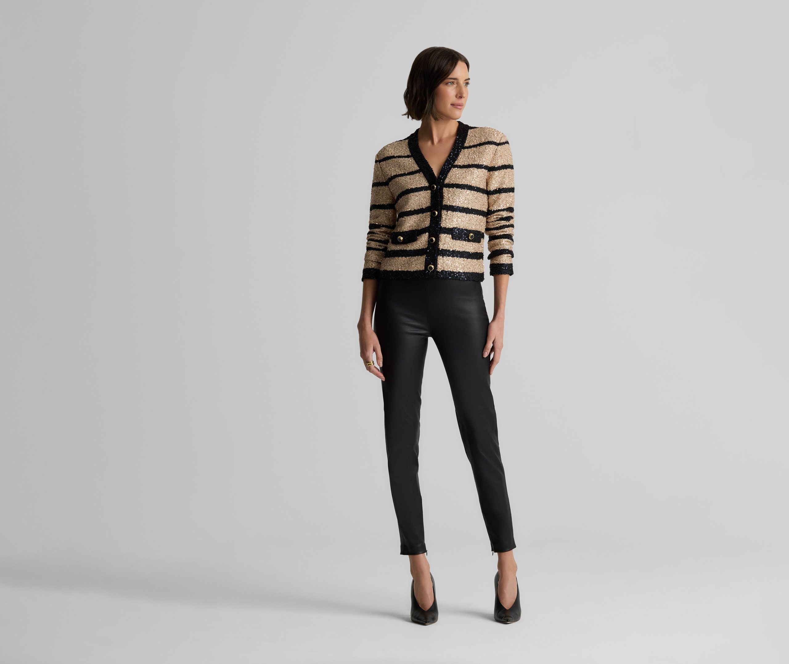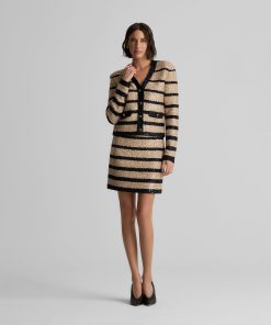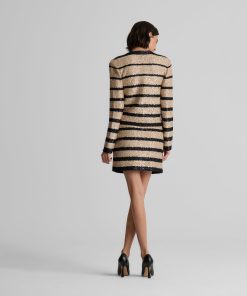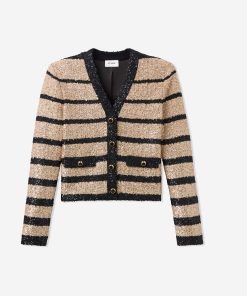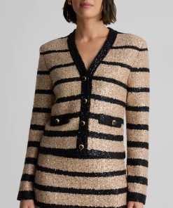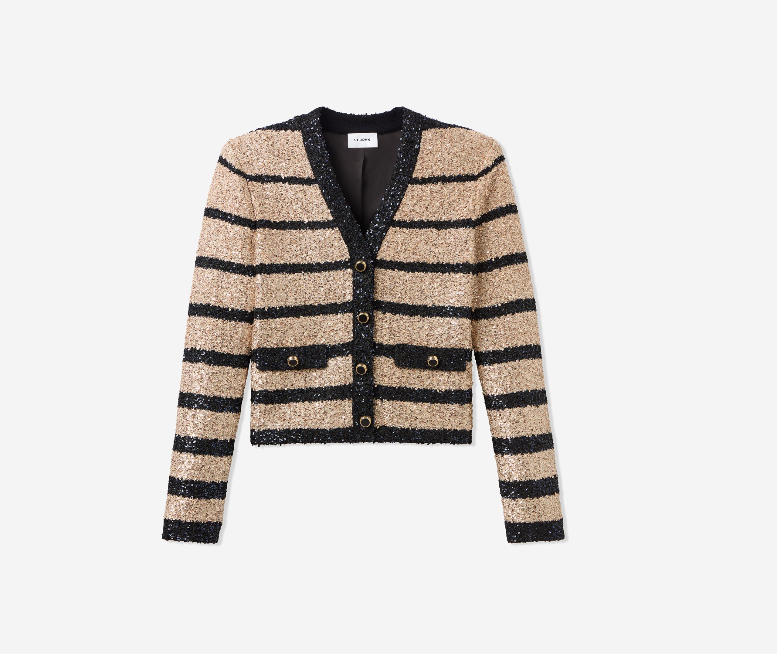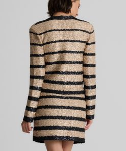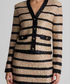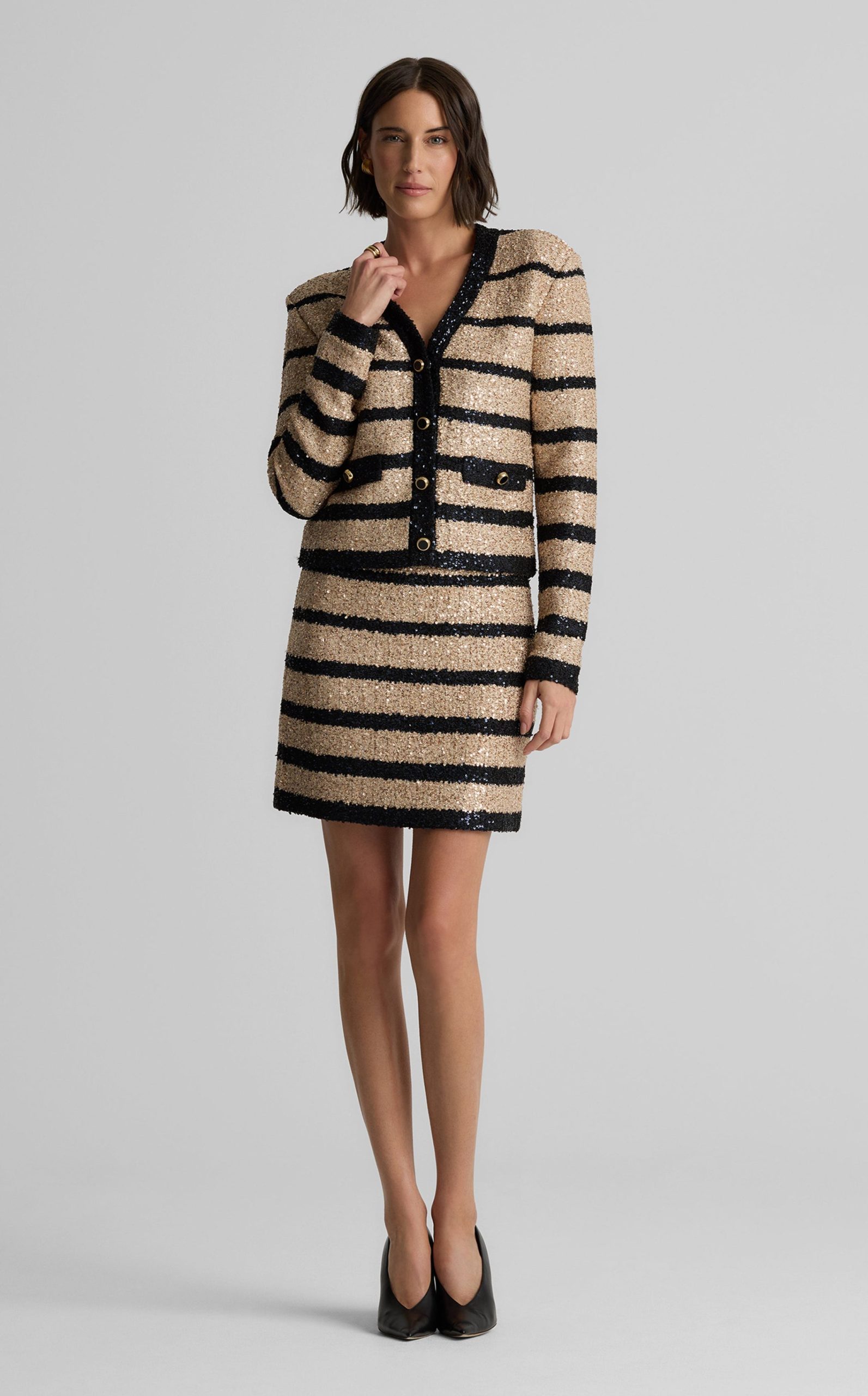 Shimmering sequins and a gradient Breton stripe give the Jolene its standout appeal. In addition to its dazzle, this tailored jacket possesses enough classic details—including a graceful V-neckline and black and gold decorative buttons—to make it a versatile piece in your formal wear collection. Want to play up the drama? Pair it with our Bonnie Skirt for a spotlight-worthy matching set.