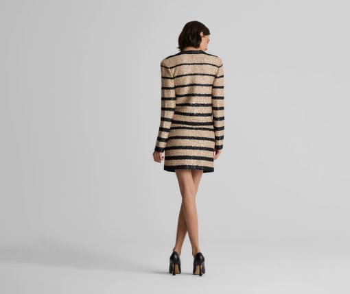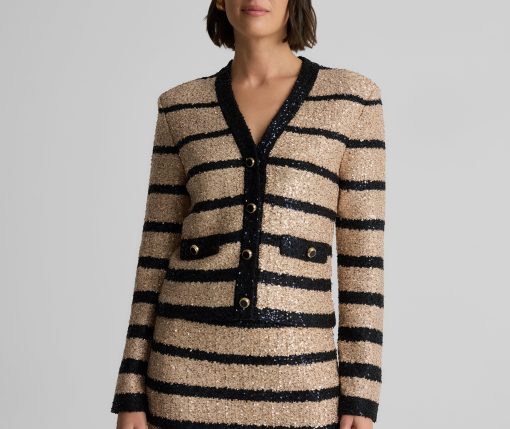 Shimmering sequins and a gradient Breton stripe give the Jolene its standout appeal. In addition to its dazzle, this tailored jacket possesses enough classic details—including a graceful V-neckline and black and gold decorative buttons—to make it a versatile piece in your formal wear collection. Want to play up the drama? Pair it with our Bonnie Skirt for a spotlight-worthy matching set.