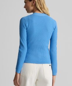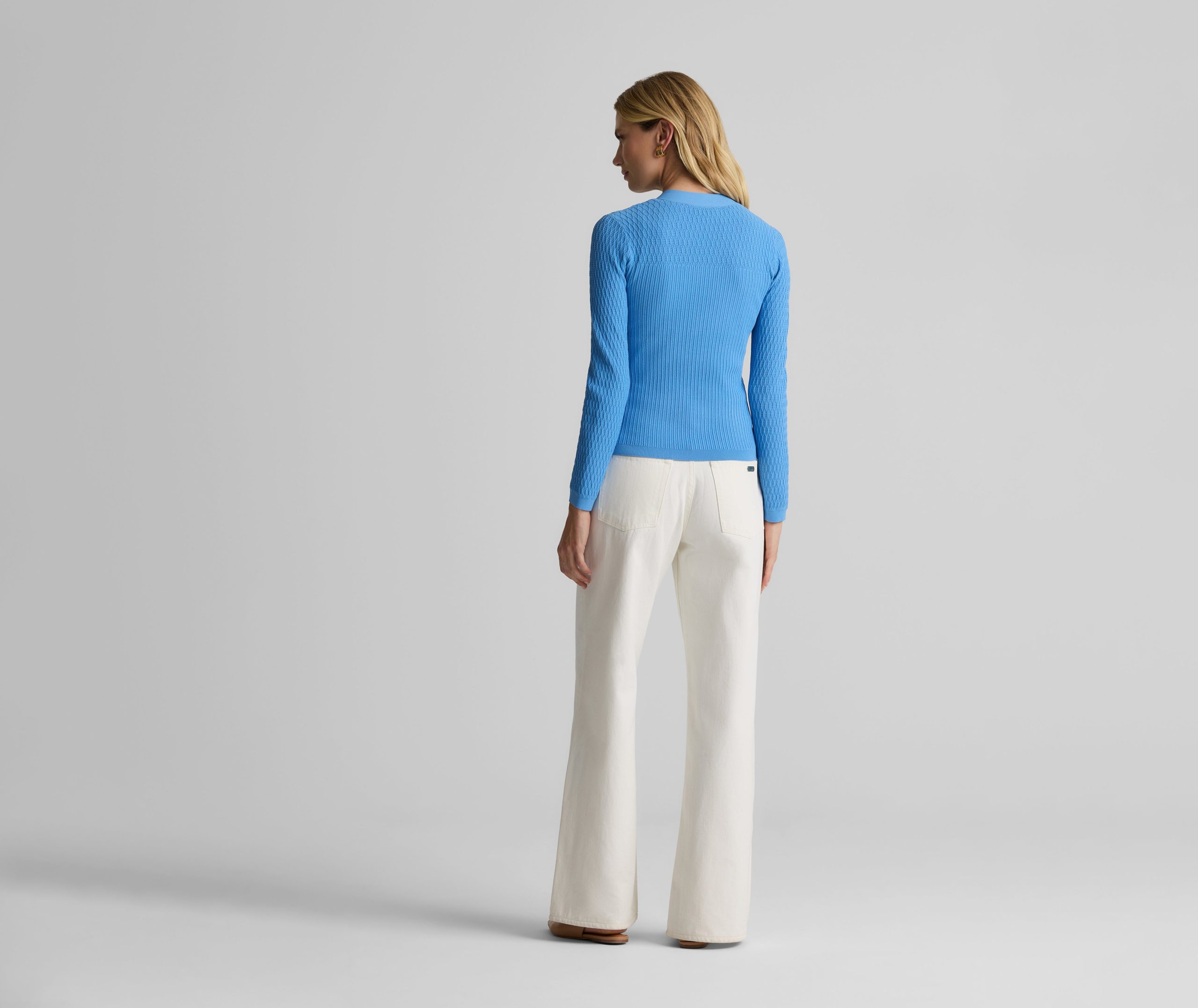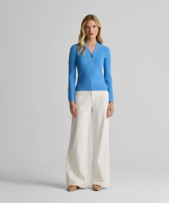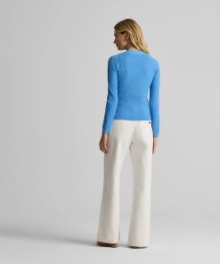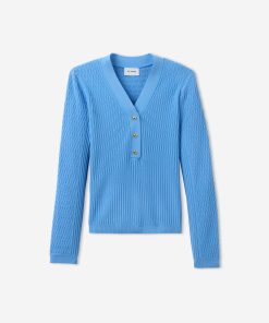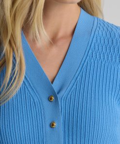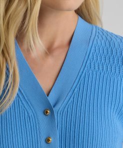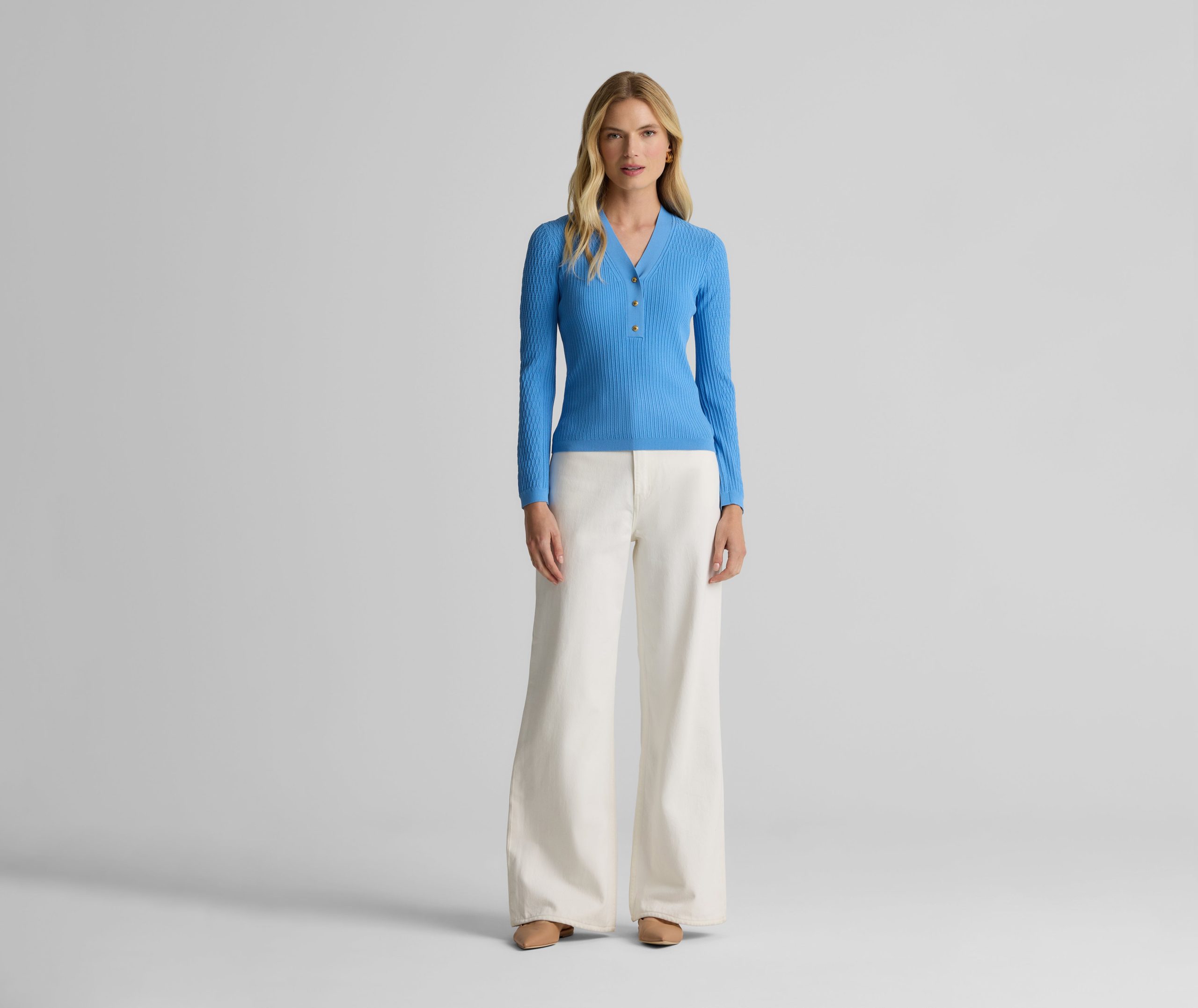 With its slim fit, graceful V-neckline, and delicate gold buttons, this fine ribbed knit sweater in light, bright Periwinkle will instantly become a treasured staple of the modern woman’s wardrobe. Wear the Remy to the office with tailored pants or on days off with denim—it brings effortless sophistication to every ensemble.