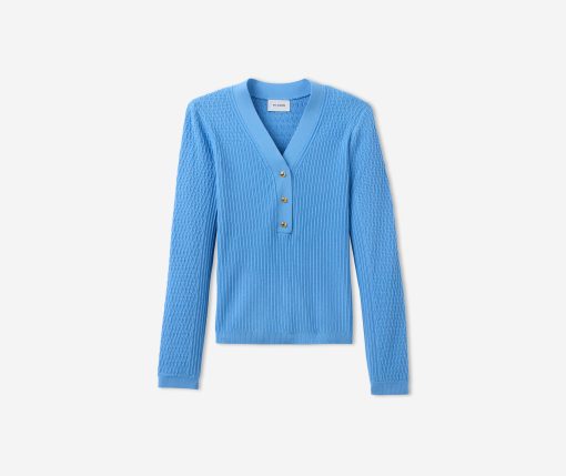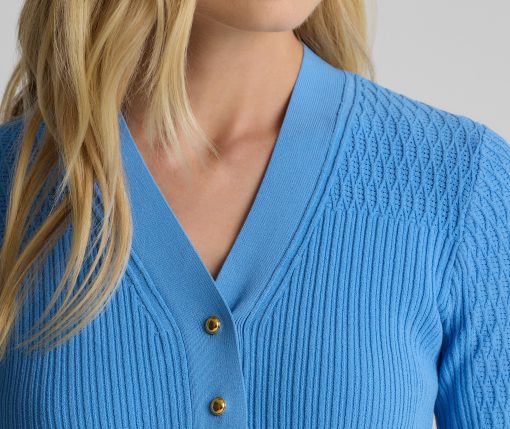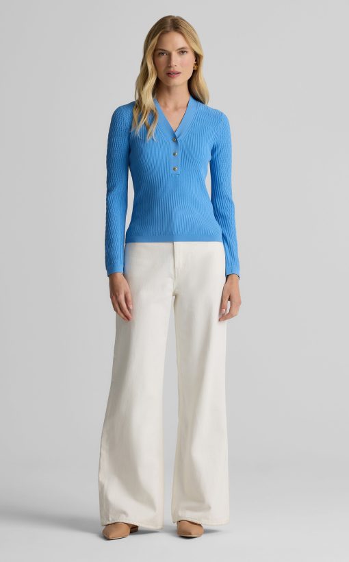 With its slim fit, graceful V-neckline, and delicate gold buttons, this fine ribbed knit sweater in light, bright Periwinkle will instantly become a treasured staple of the modern woman’s wardrobe. Wear the Remy to the office with tailored pants or on days off with denim—it brings effortless sophistication to every ensemble.
